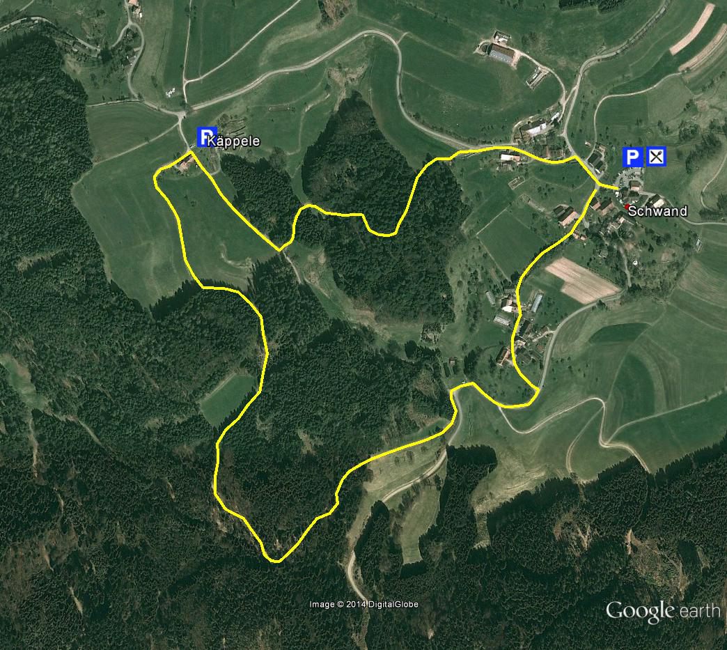 folgen der Teerstraße halbrechts bergauf auf Schwand zu. Nach dem Ortsschild Schwand biegen wir