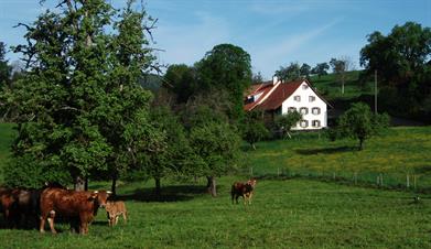 Fahrweg geradeaus, der uns nun steil bergauf ins Oberdorf führt. Hier treffen wir wieder auf die