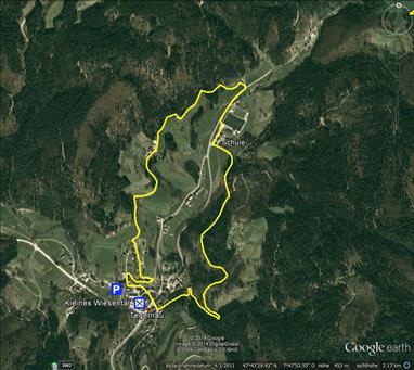 Landstraße nach rechts, überqueren den Fluss „Kleine Wiese“ und biegen nach ca. 200 m links in den