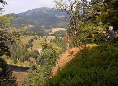 den steilen Abstieg zum Weiher ermöglicht. Nach einigen hundert Metern wird der Weg wieder breiter