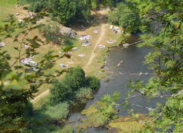 Uferseite liegt ein grasiger Hang mit Grillstelle und einer kleinen Badebucht, mit schwimmenden